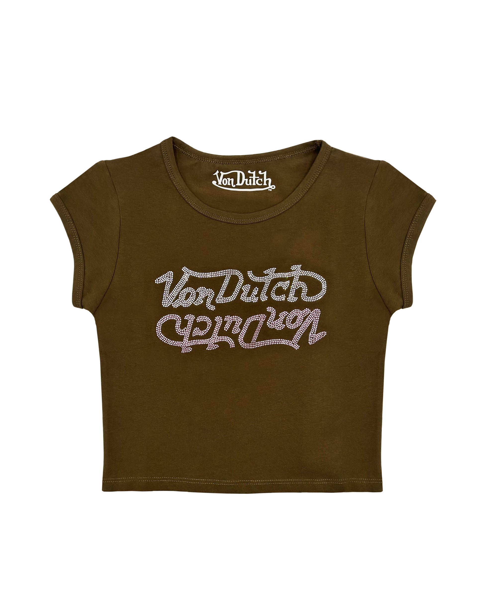 This cropped baby tee features a double script rhinestone Von Dutch logo.