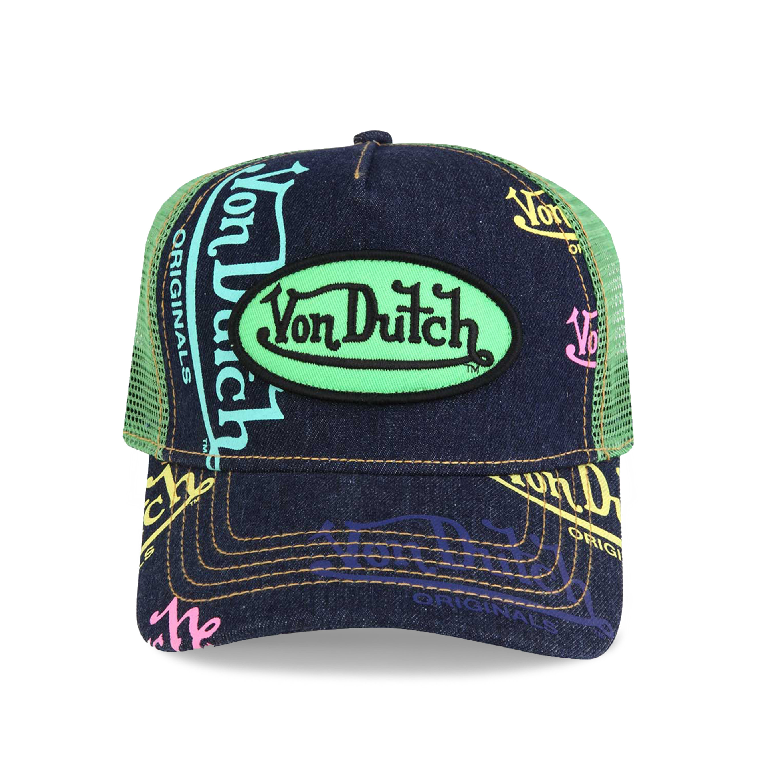This Classic Snapback Trucker Hat by Von Dutch features Denim Logo print with iconic logo patch on front, a Green Apple breathable mesh rear, and an adjustable snapback panel. All headwear sales are final. Navy Blue Denim trucker cap Von Dutch Green Apple logo patch Breathable Green Apple mesh rear…