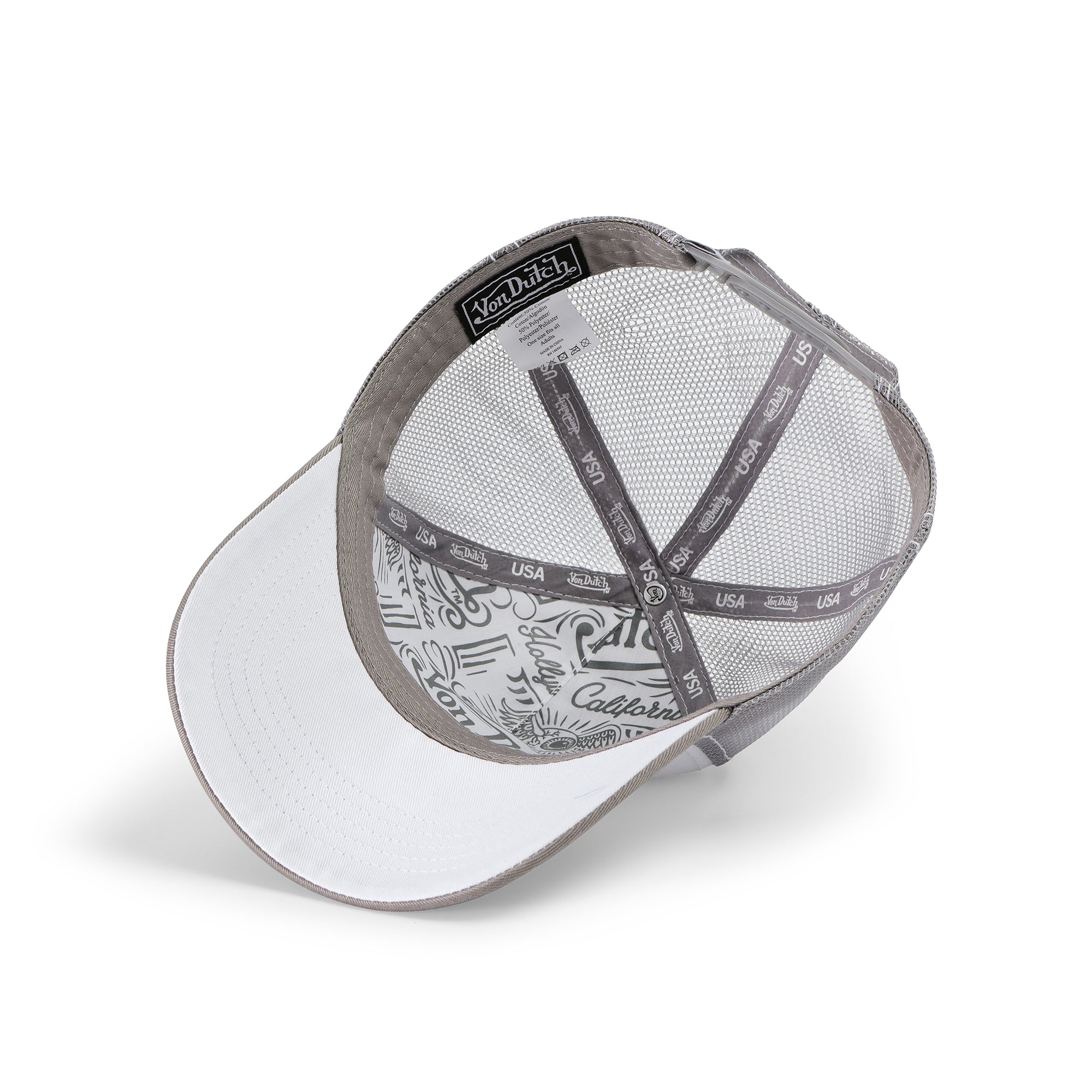 This Classic Snapback Trucker Hat by Von Dutch in Gray and White with the iconic logo patch on front, Gray breathable mesh rear, and an adjustable snapback panel.