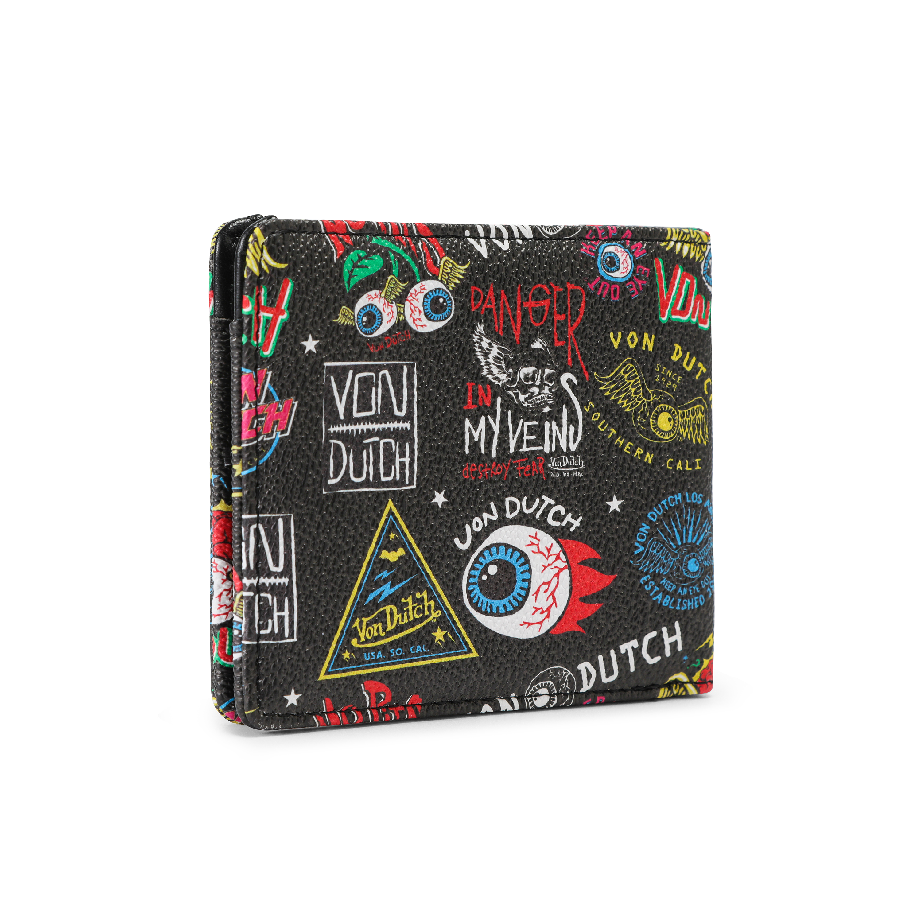 Classic Von Dutch vegan leather wallet for everyday use. Colors : Black Vegan leather exterior with subtle texture All Over Jax Print Graphic Bifold design that stays slim in pocket Multiple card slots for daily essentials Full-length compartment for cash and receipts Durable construction made for regular wear and tear…