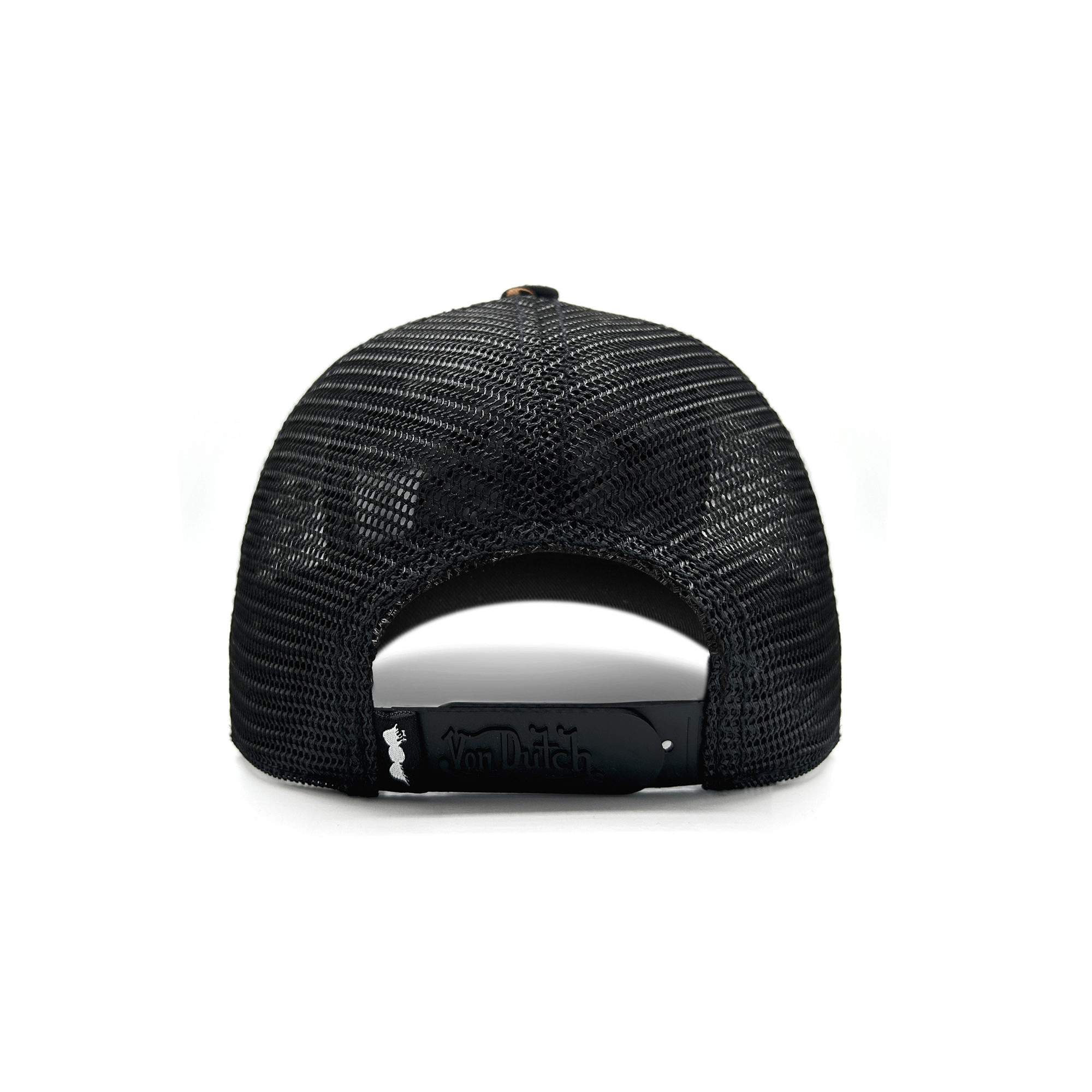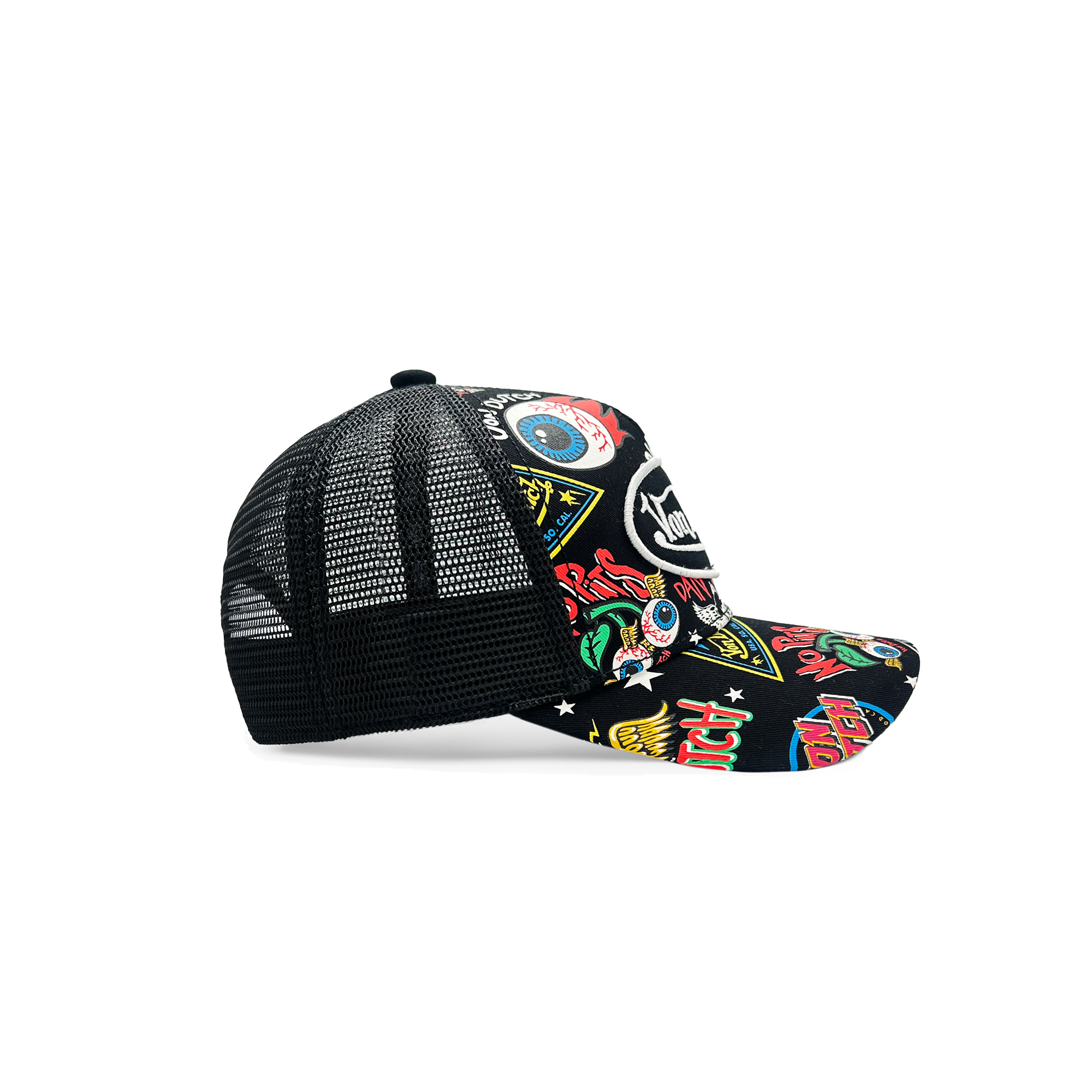 This Classic Snapback Trucker Hat by Von Dutch features an over black jax print with iconic logo patch on front, breathable mesh rear, and an adjustable snapback panel. All headwear sales are final.