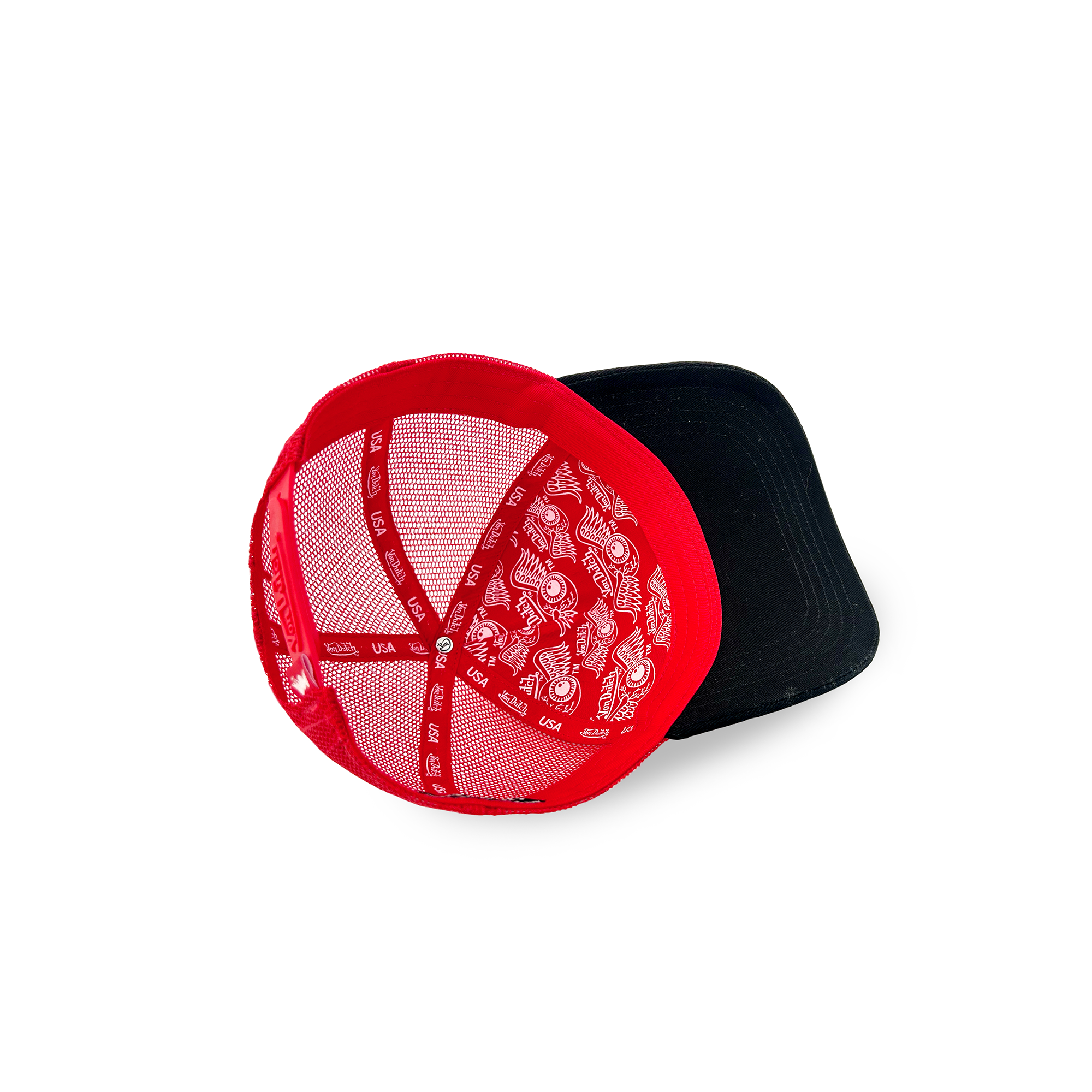 This Classic Snapback Trucker Hat by Von Dutch features a canvas front panel with the iconic logo patch on front with flying eye inside, red breathable mesh rear, and an adjustable snapback panel. All headwear sales are final.