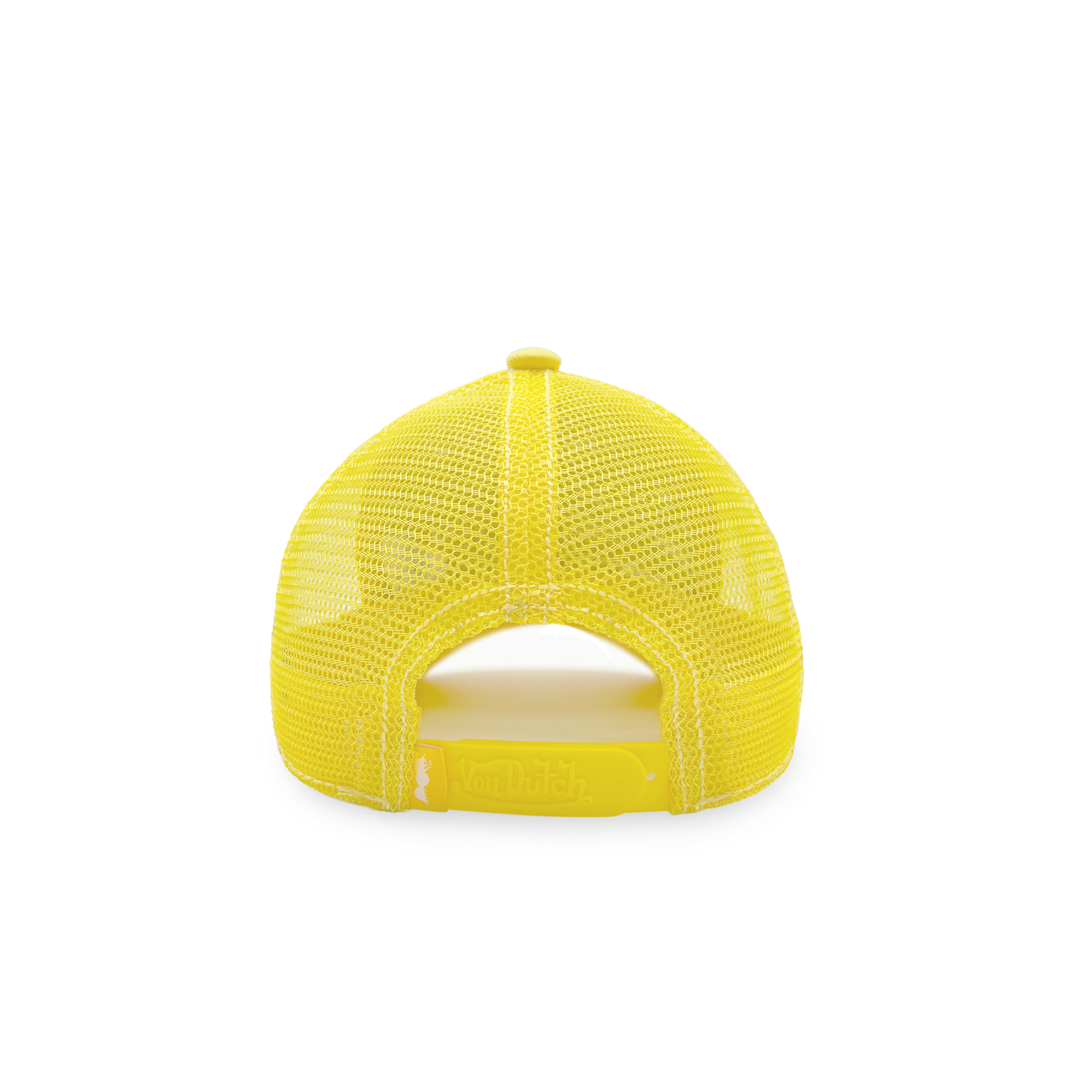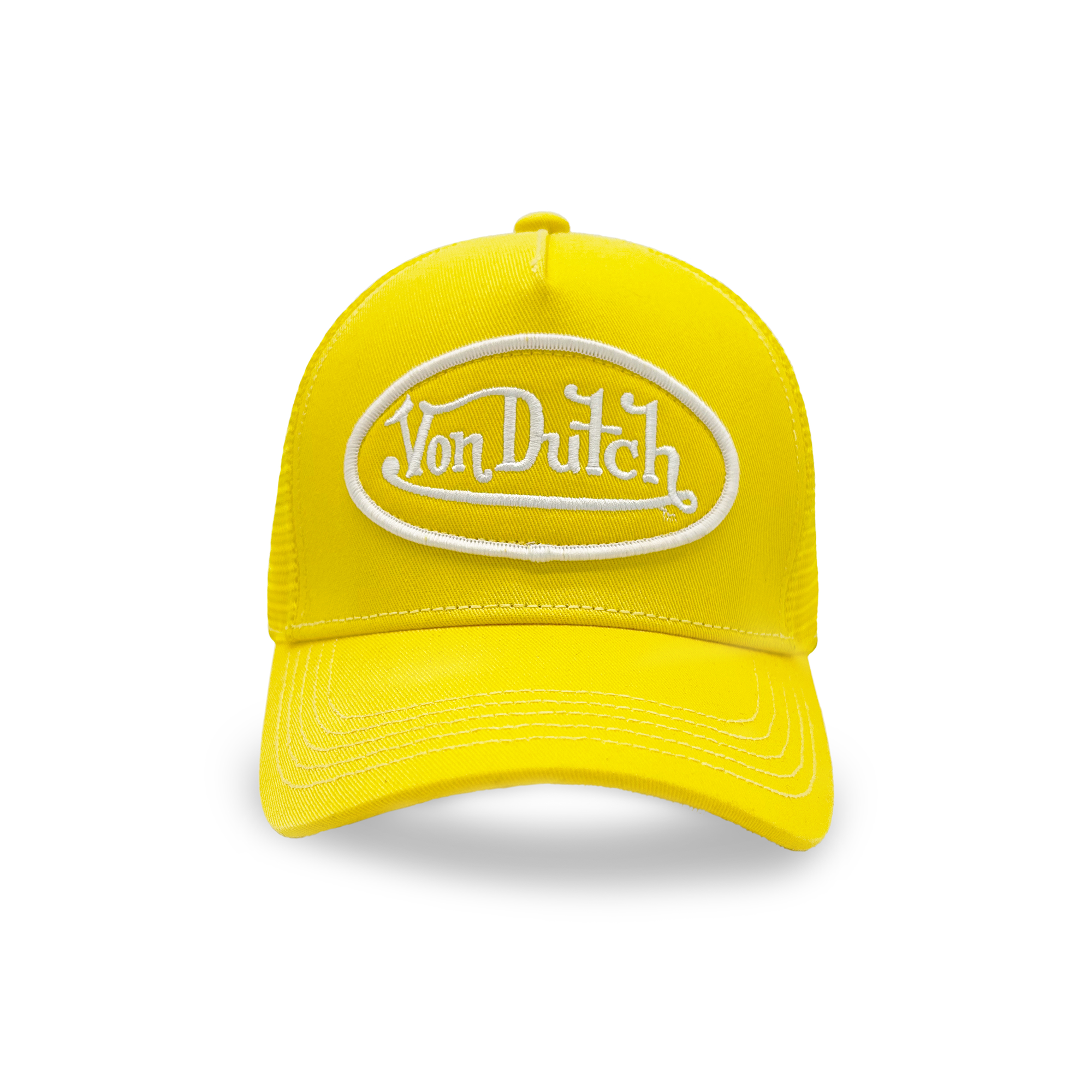 This Classic Snapback Trucker Hat by Von Dutch features a canvas front panel with the iconic logo patch on front, yellow breathable mesh rear, and an adjustable snapback panel. All headwear sales are final.