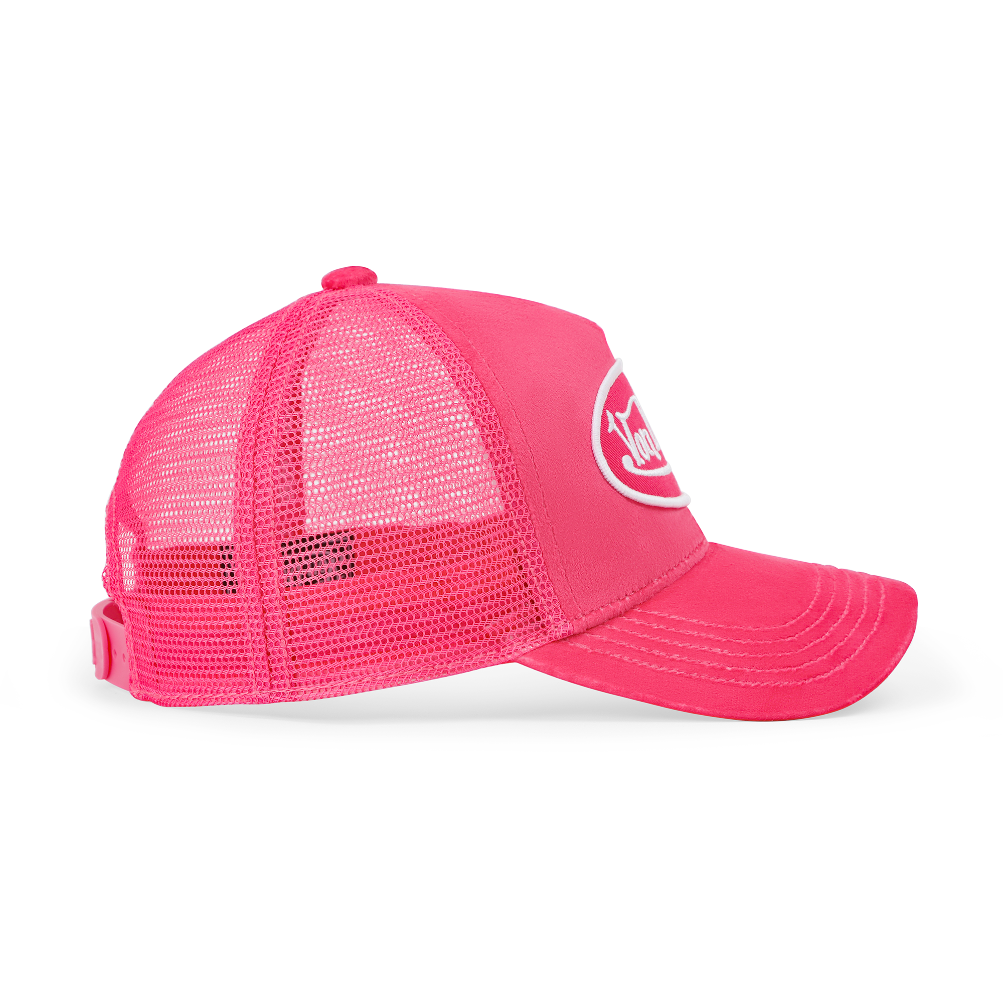 This Classic Snapback Trucker Hat by Von Dutch features a Hot Pink velvet with the iconic logo patch on front, pink breathable mesh rear, and an adjustable snapback panel. All headwear sales are final.