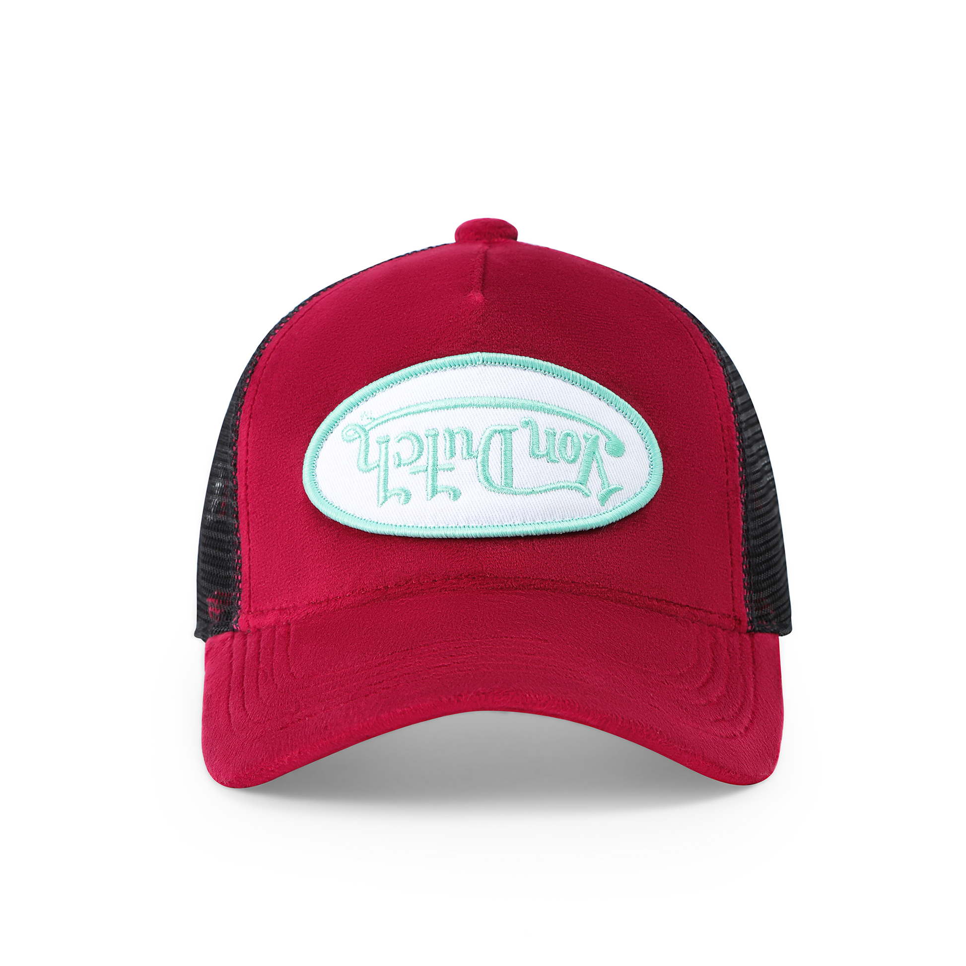 This Classic Snapback Trucker Hat by Von Dutch features a red velvet with the iconic logo patch on front, black breathable mesh rear, and an adjustable snapback panel. All headwear sales are final.
