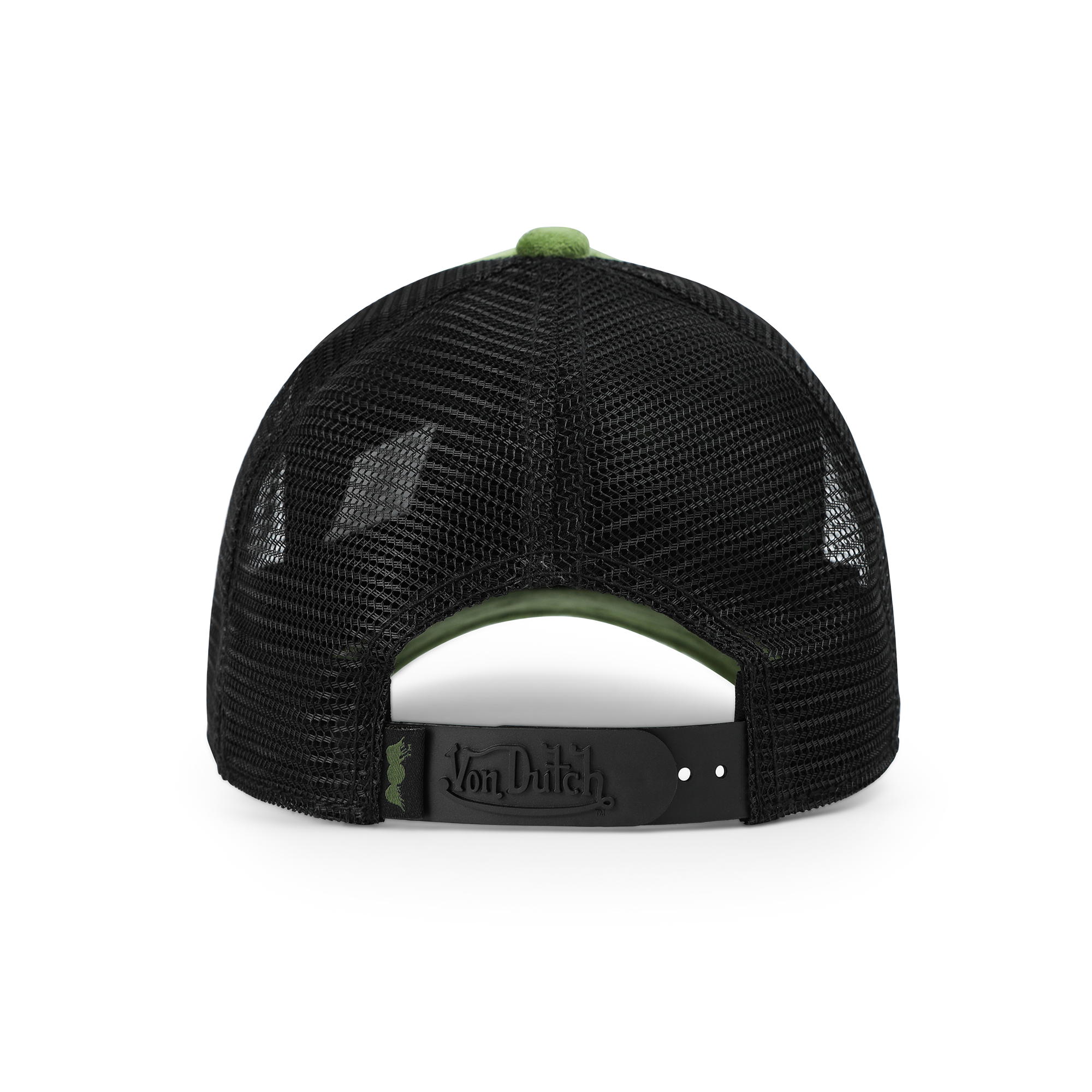 This Classic Snapback Trucker Hat by Von Dutch features a green velvet with the iconic logo patch on front, black breathable mesh rear, and an adjustable snapback panel. All headwear sales are final.