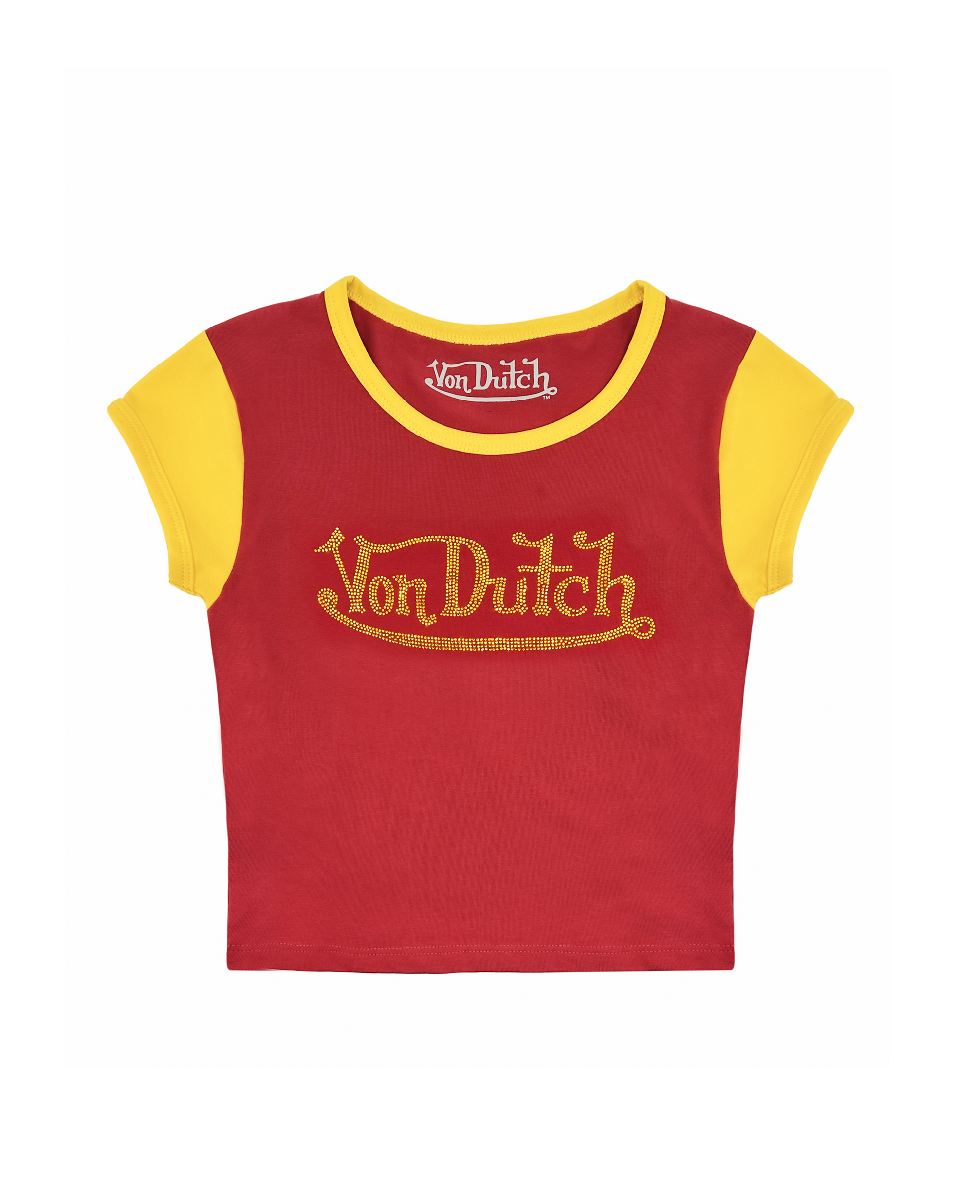 This cropped baby tee features a yellow Von Dutch logo.