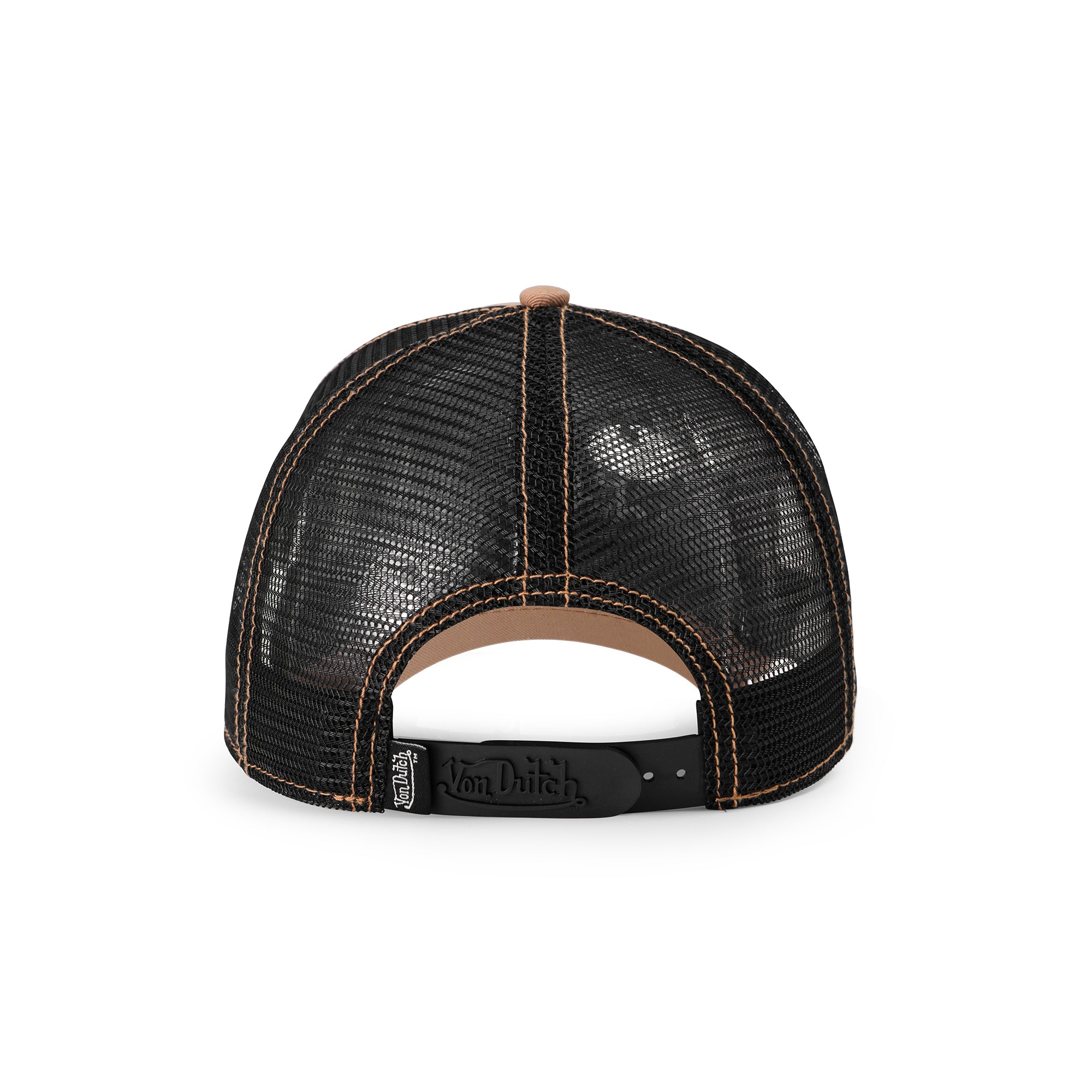 This Classic Snapback Trucker Hat by Von Dutch in taupe, off-white and black. Features the iconic logo patch on front, black breathable mesh rear, and an adjustable snapback panel. All headwear sales are final.