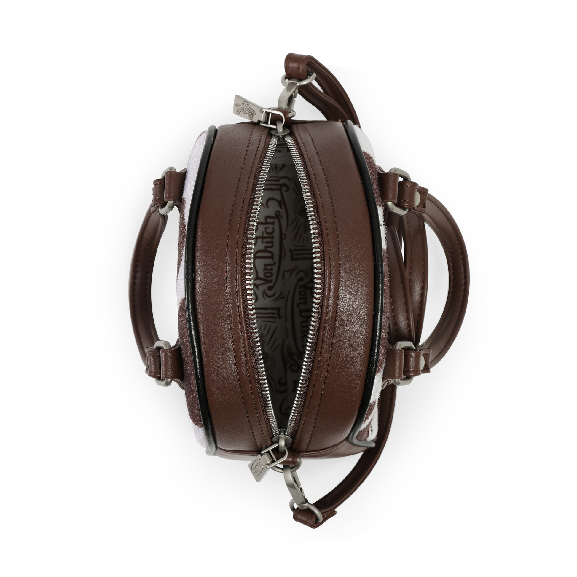 Make a bold entrance with this vibrant Brown and white cow-print bowling bag from Von Dutch—a statement accessory that blends playful flair with everyday functionality.