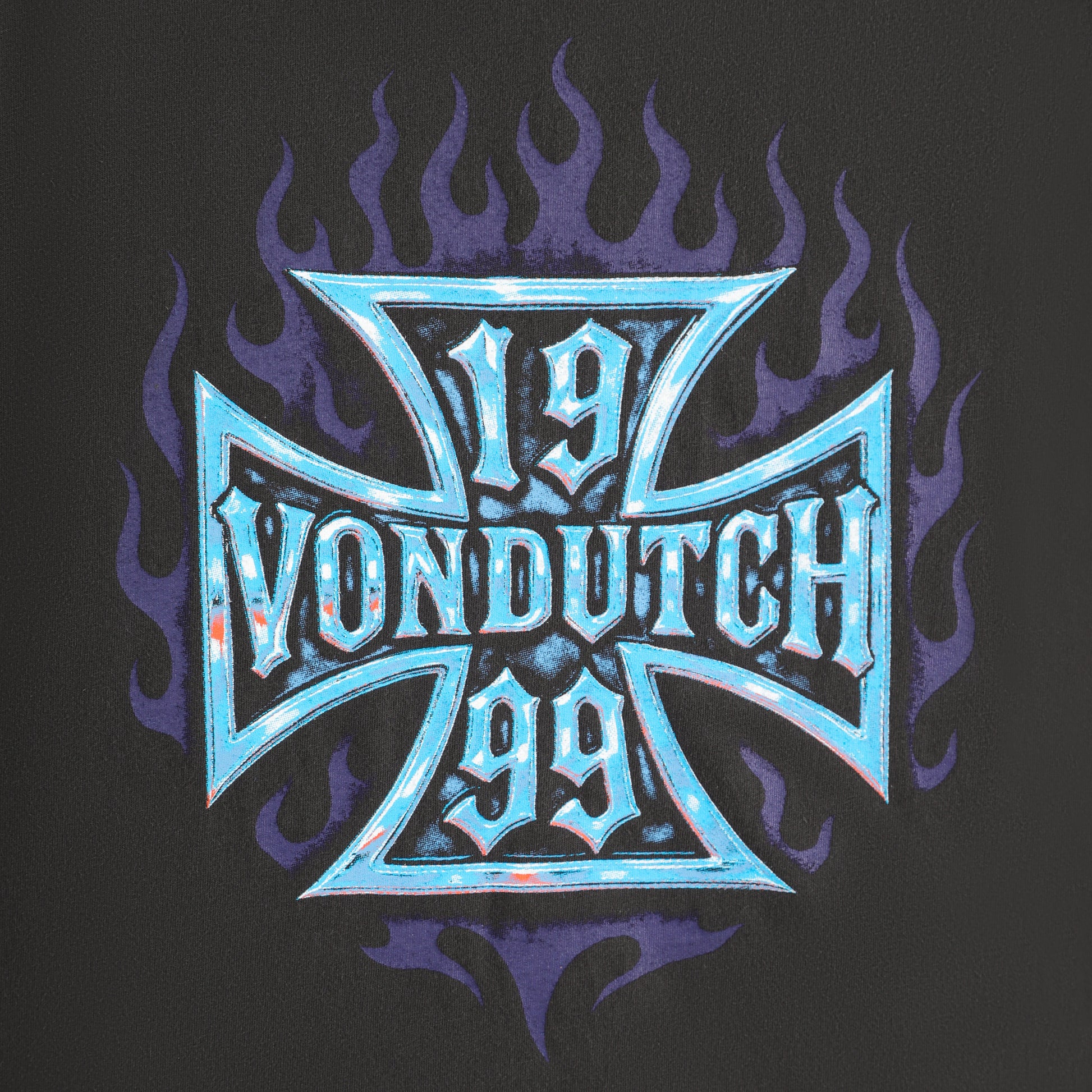 Screen-printed Von Dutch chopper cross with flames graphic on front