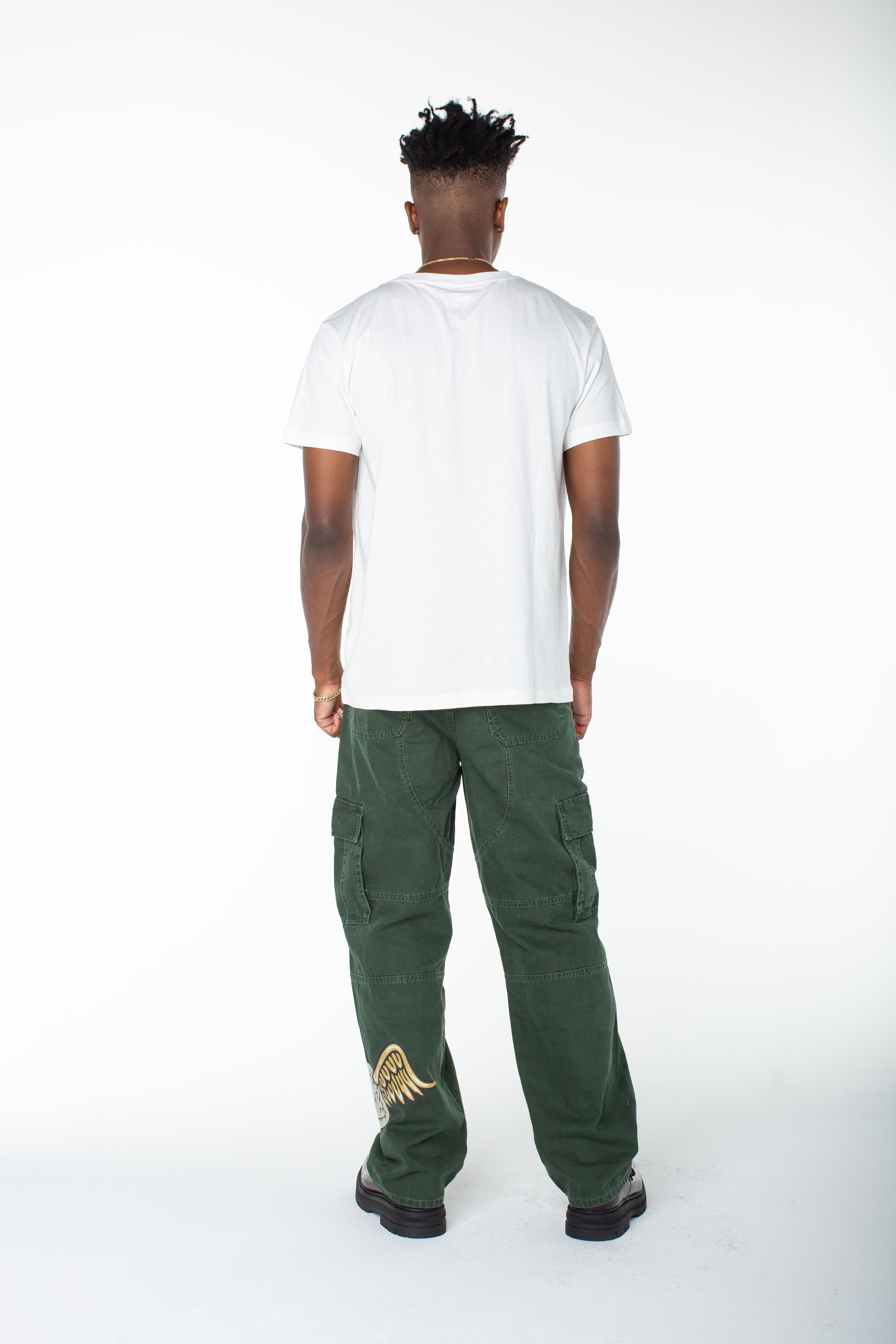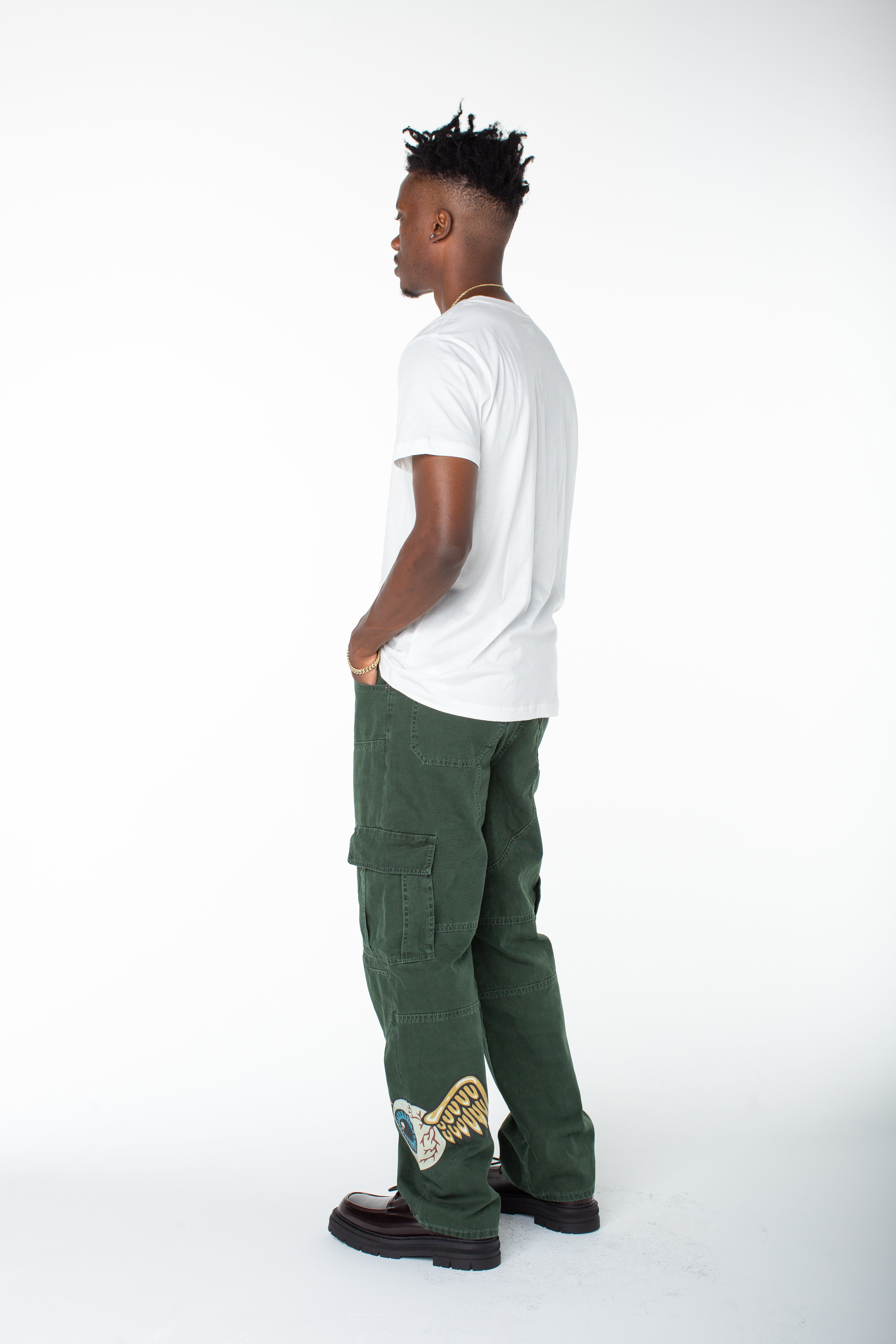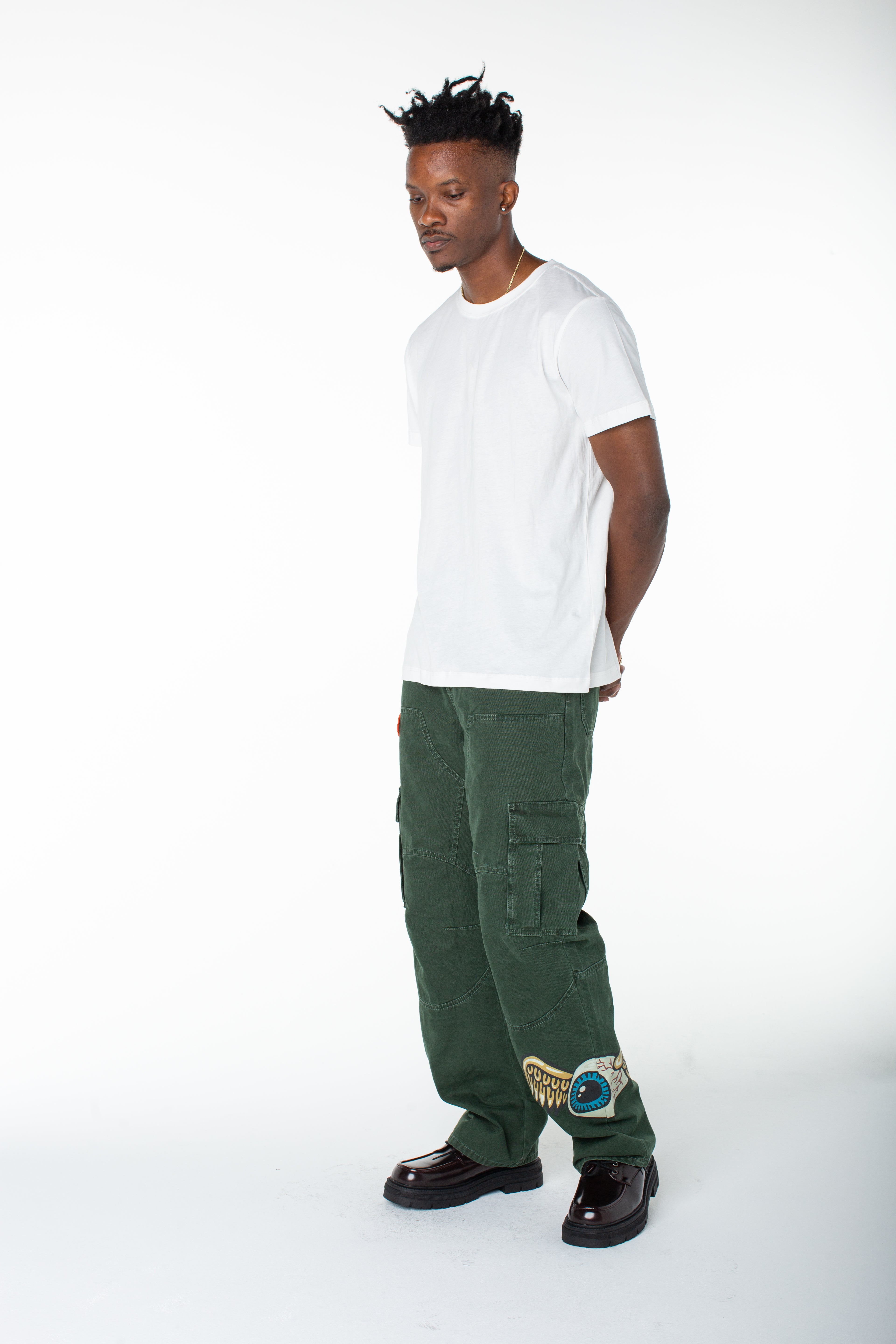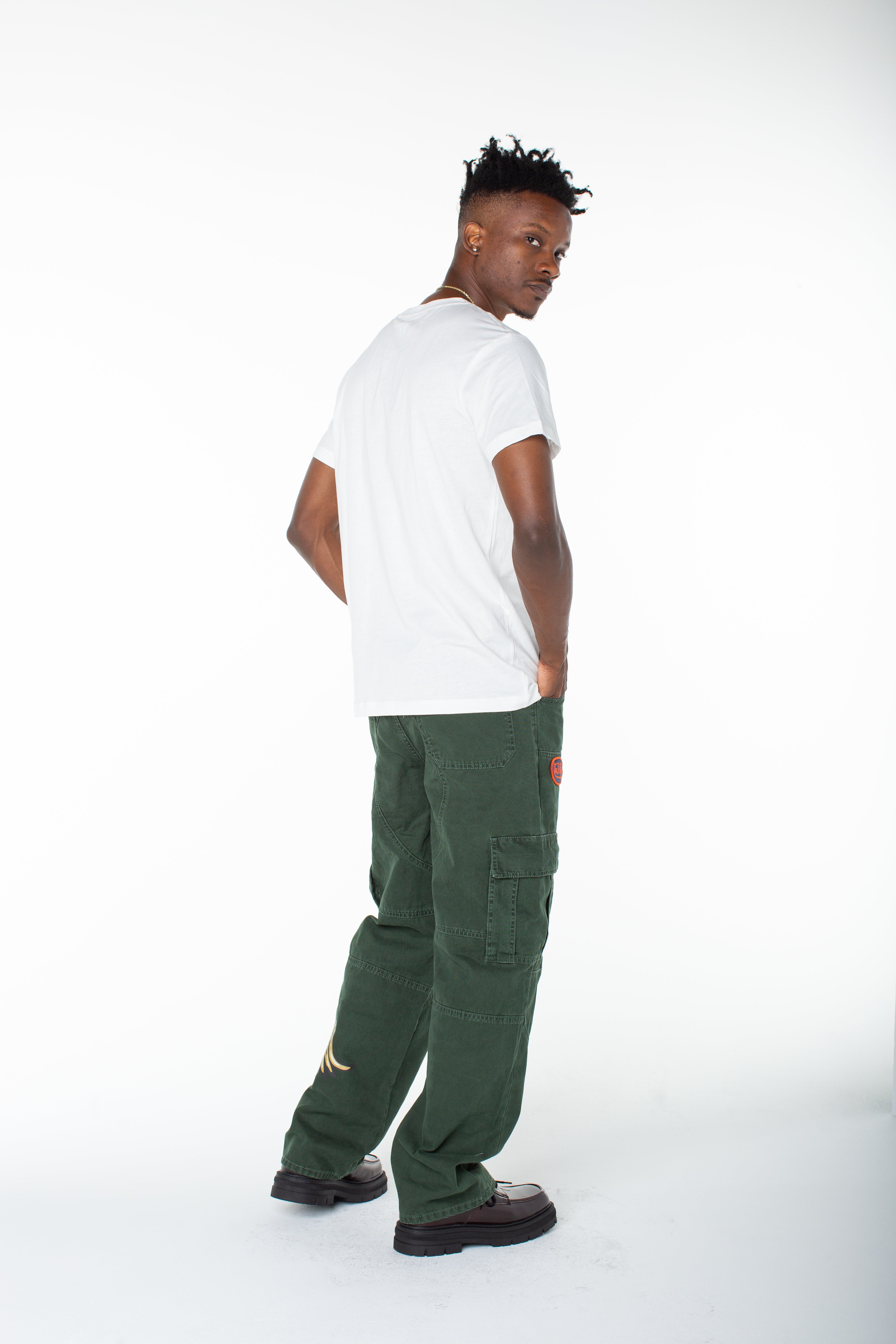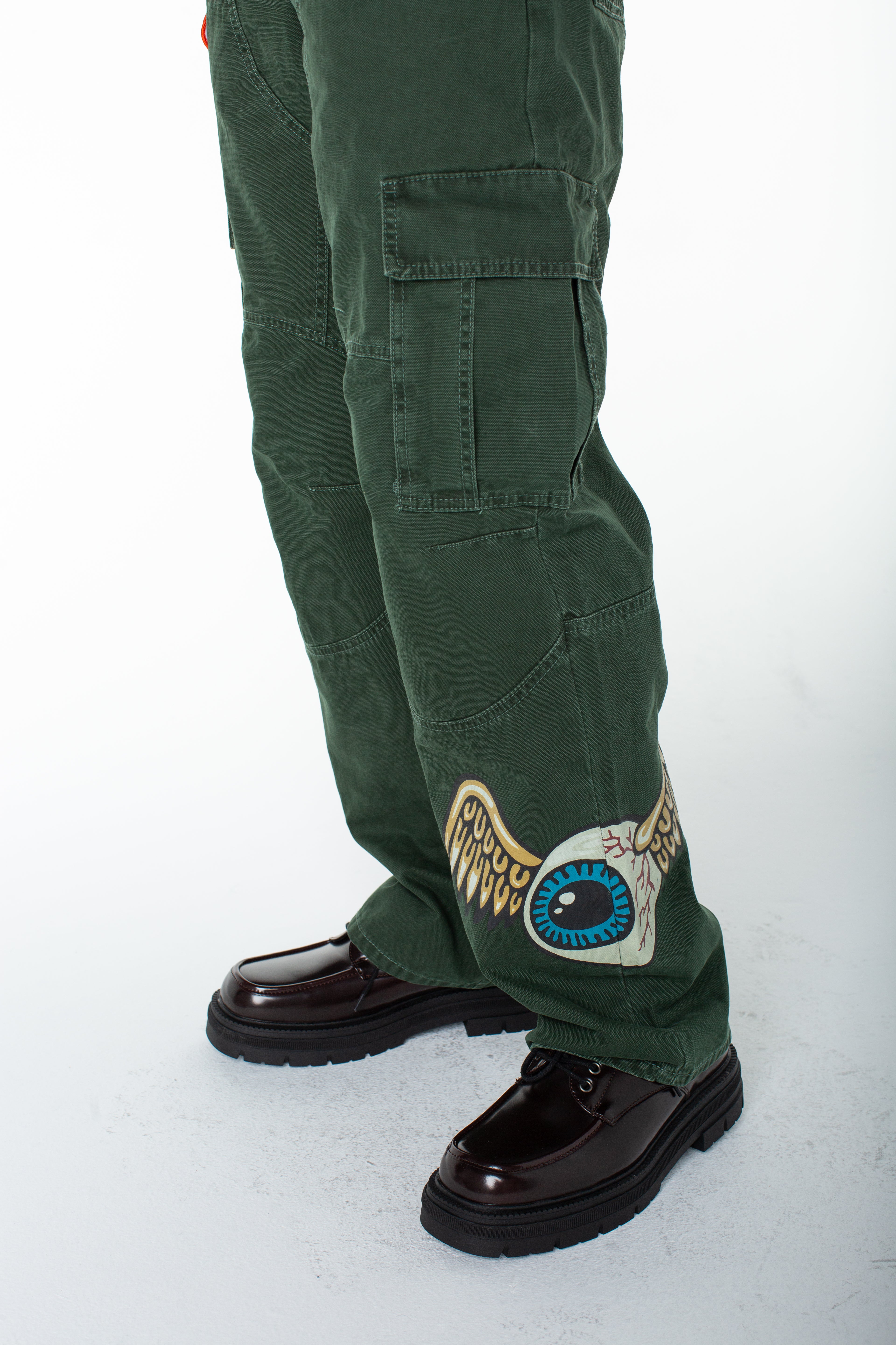 Serve streetwear casual in a baggy cargo that features a bold contrasting graphic and an upper right side patch. Match this with the coordinating zip up "invaders hoodie"