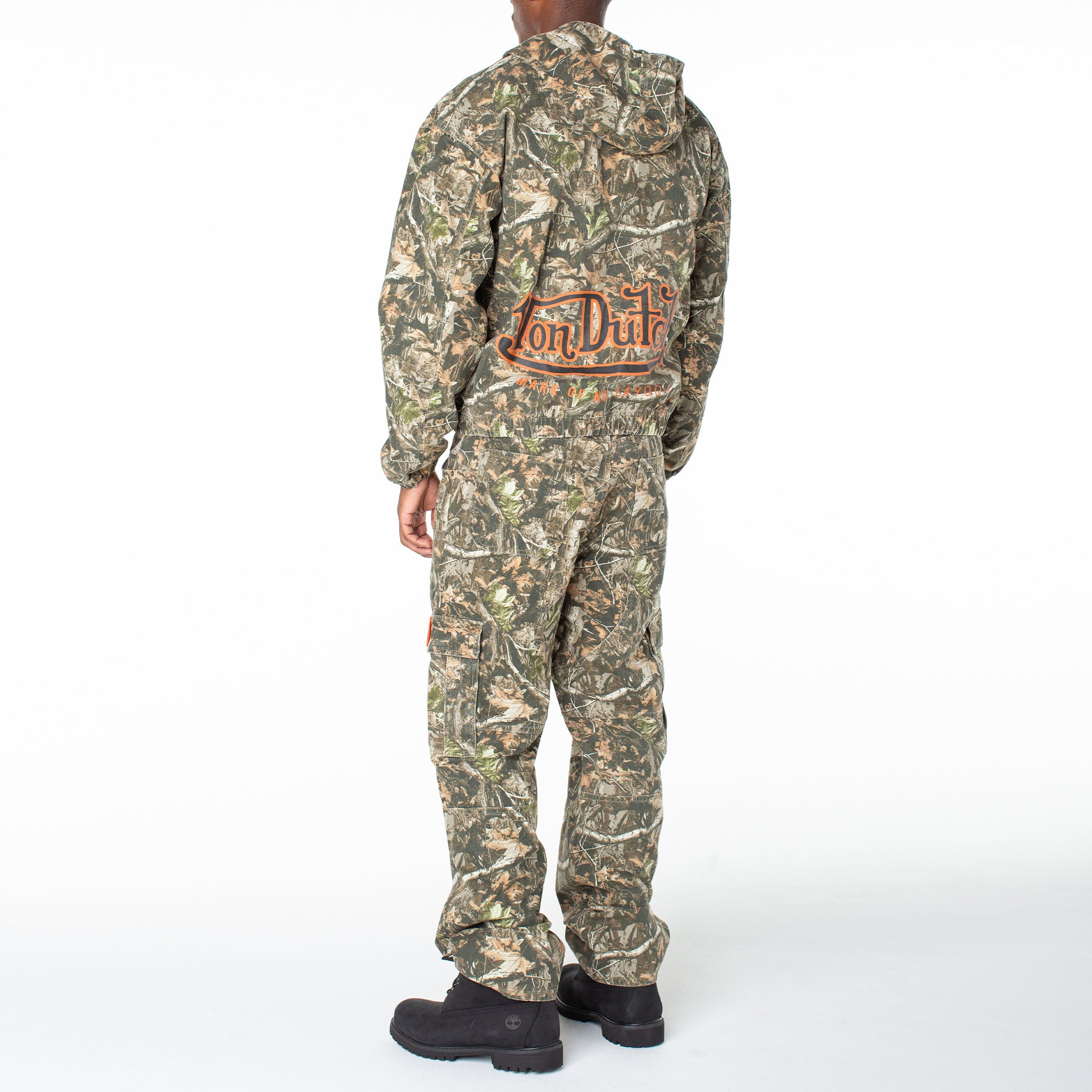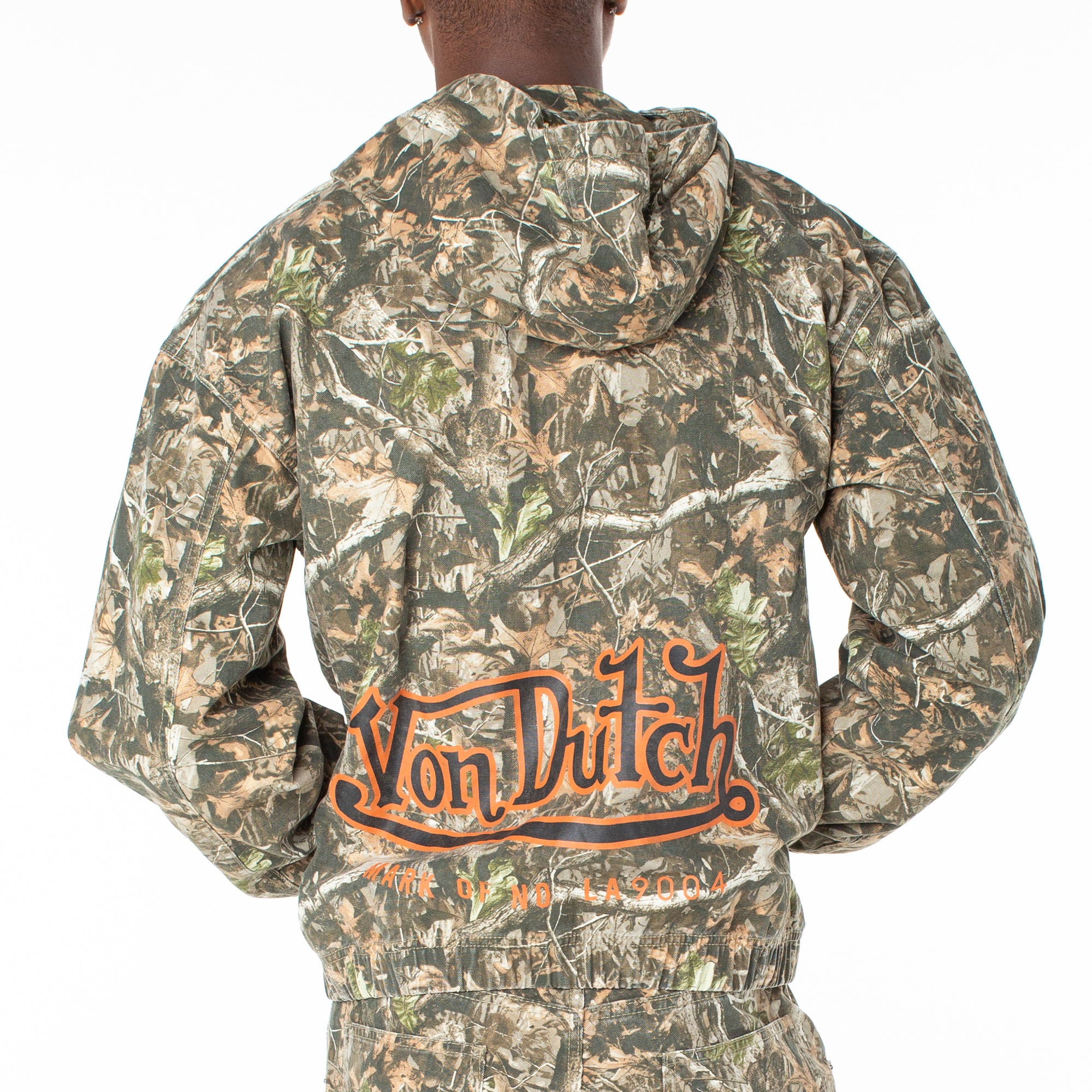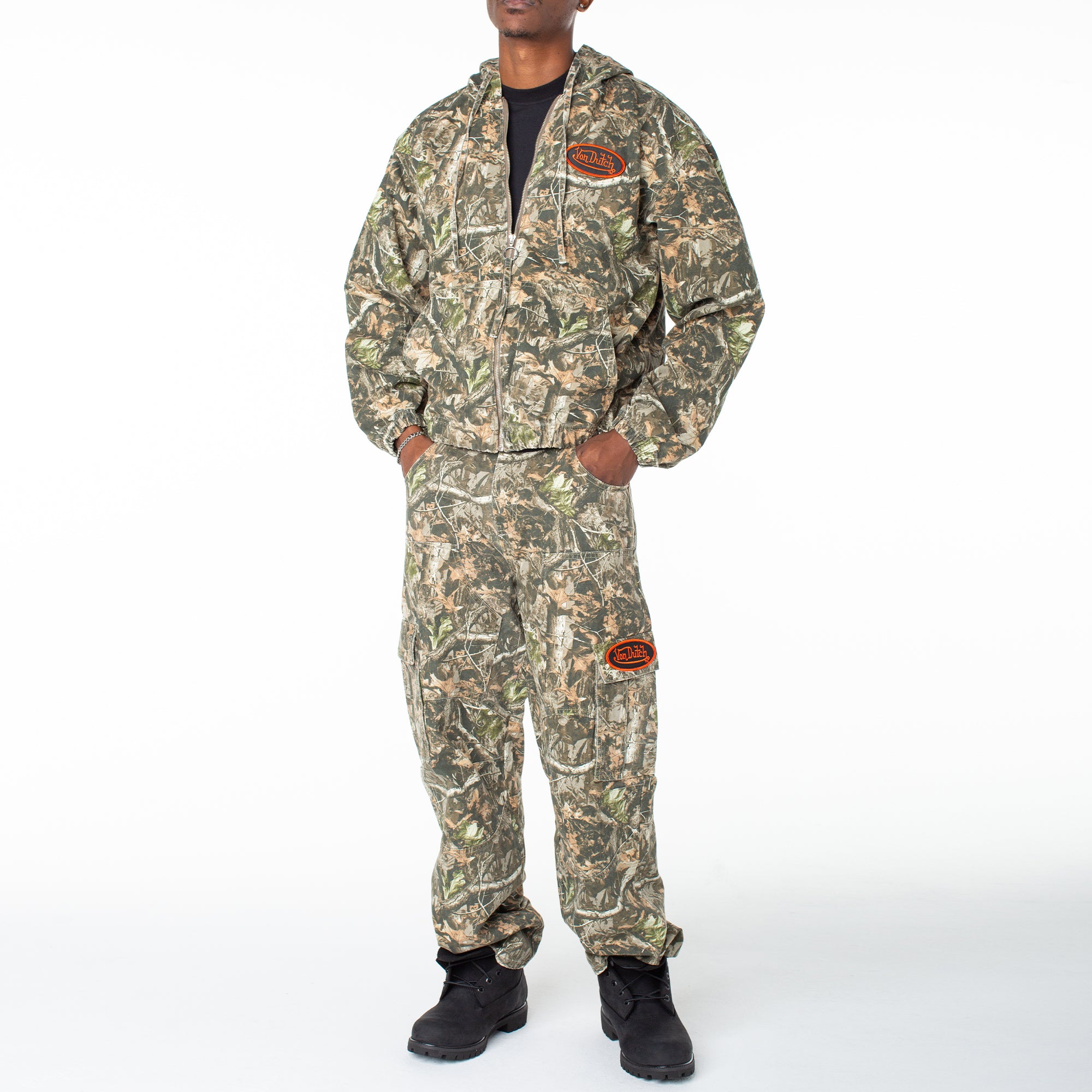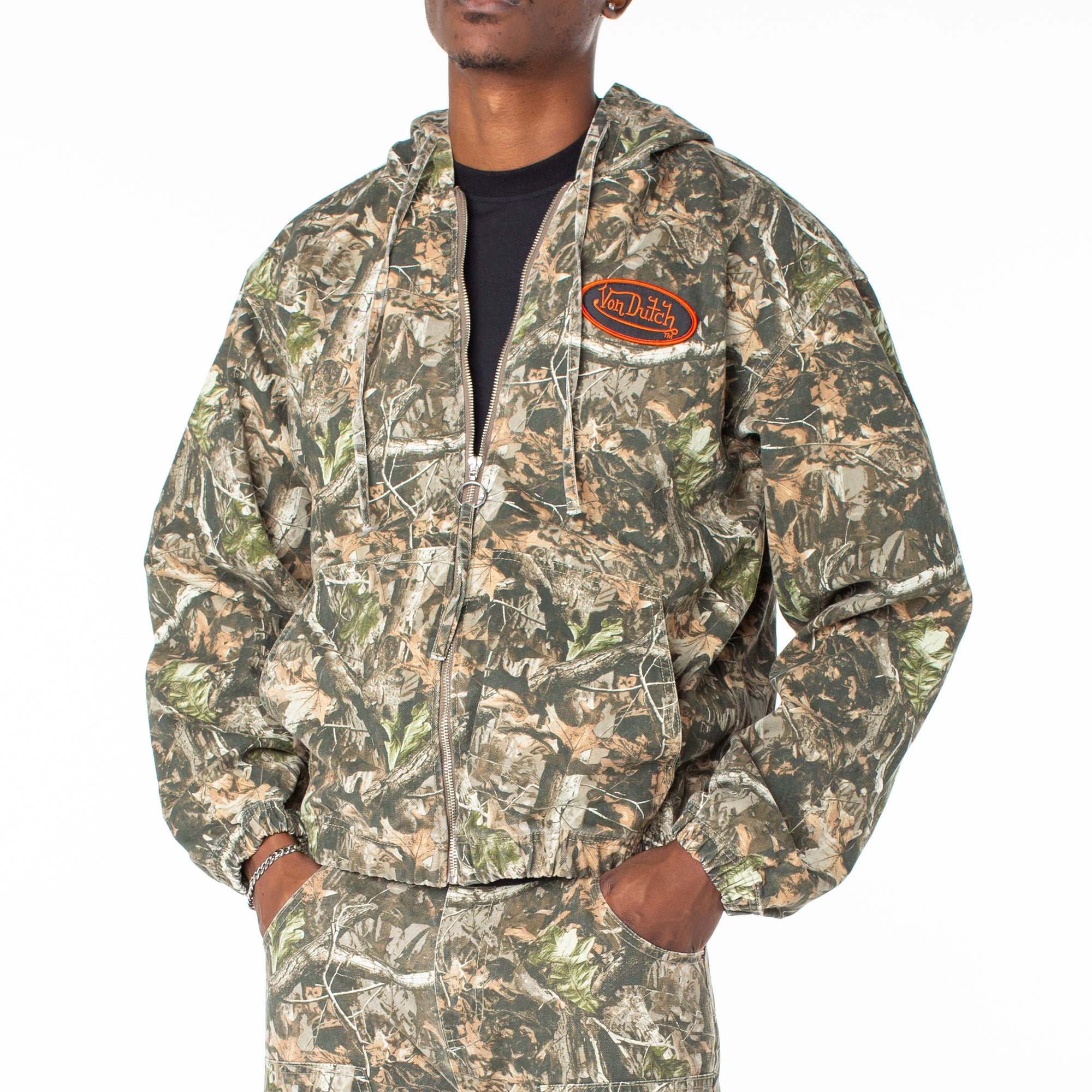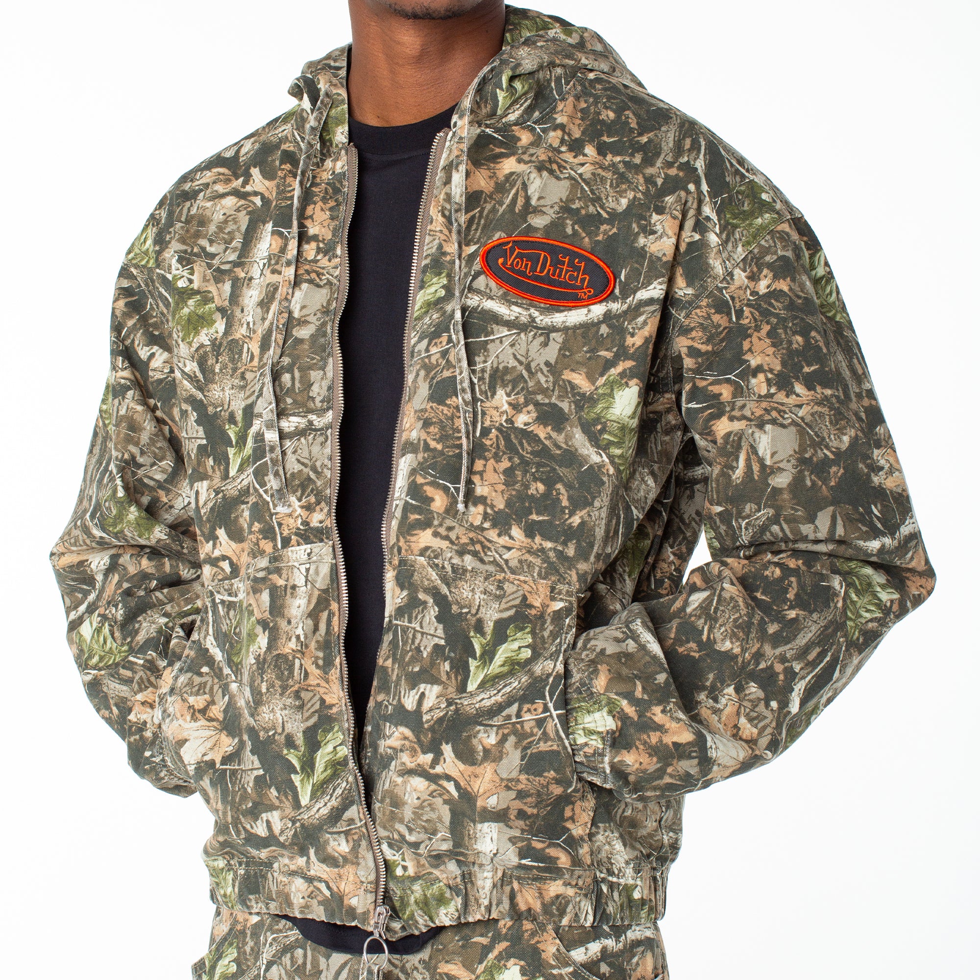 Blend in while standing out in this canvas zip-up hoodie in camo and complete the fit with it's matching camo cargo pant for a go-to set perfect for a night out. 27 1/2" Length 100% Cotton Machine wash cold tumble dry  Two layer hood / Front zip closure Screenprint logo …