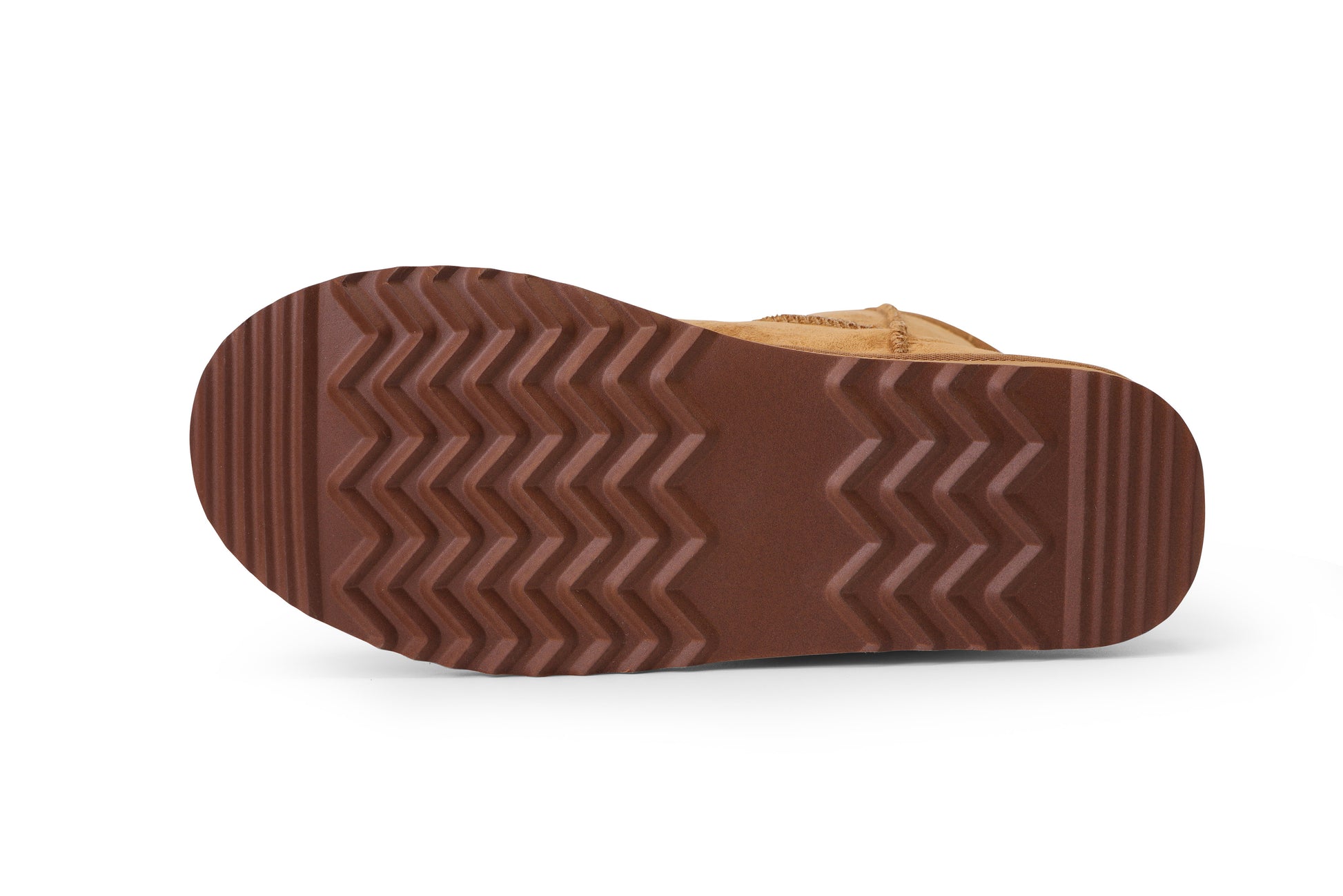 Chestnut color faux suede boot lined in cream faux wool shearling