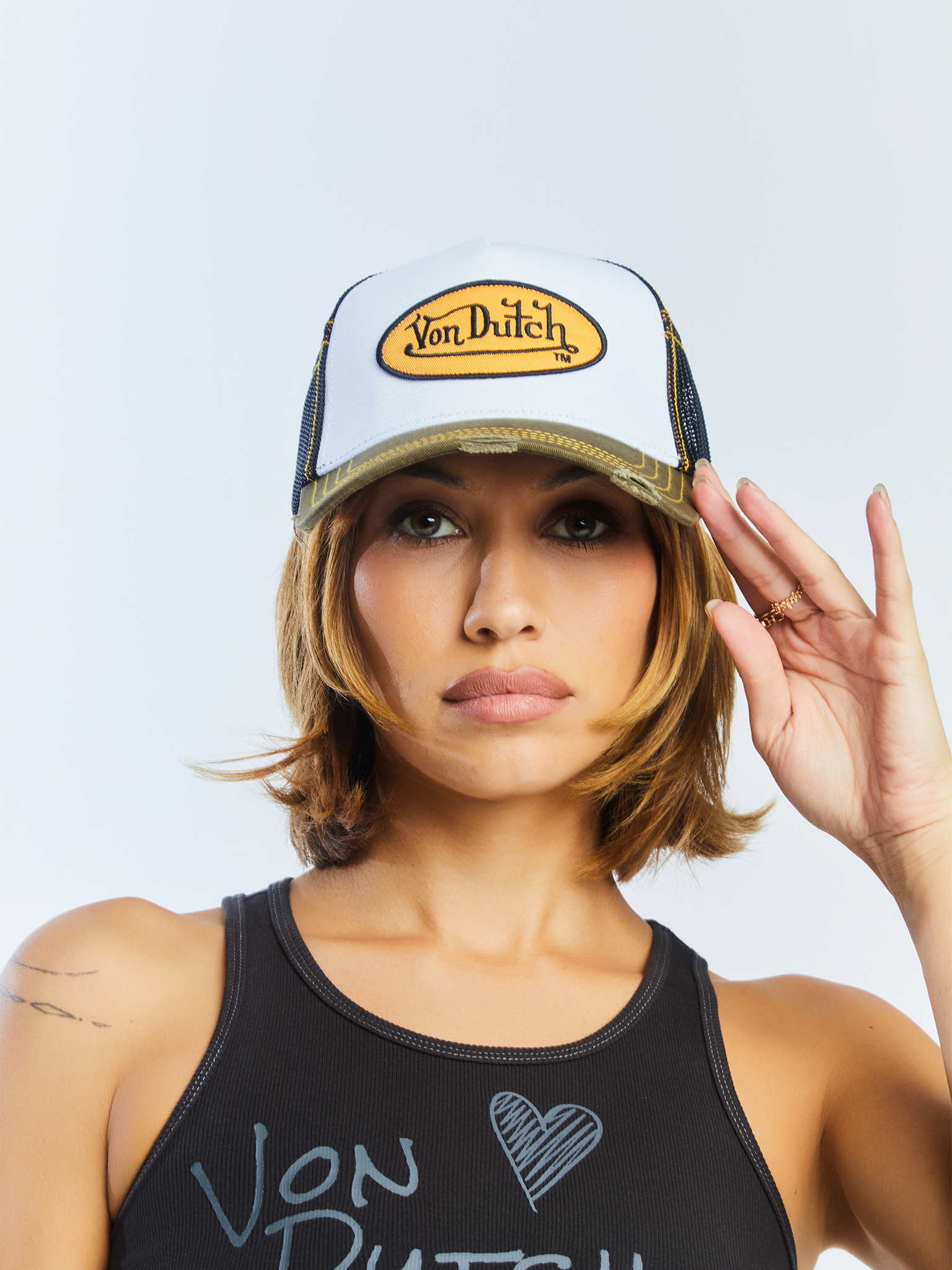 This Classic Snap back Trucker Hat by Von Dutch in White,Olive Green Brim with the classic logo in yellow. Features the iconic logo patch on front, black breathable mesh rear, and an adjustable snap back panel. All head wear sales are final. Specifications: Front panel with Von Dutch logo patch…